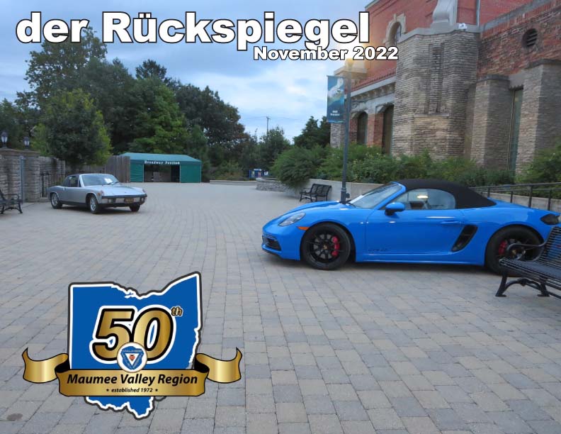 Cover: Roger Holliday’s 1972 914 and Bob Harris’s 2022 Boxster GTS at the Toledo Zoo Aquarium representing our 50 yrs. - Photo by Jeanne Krauser